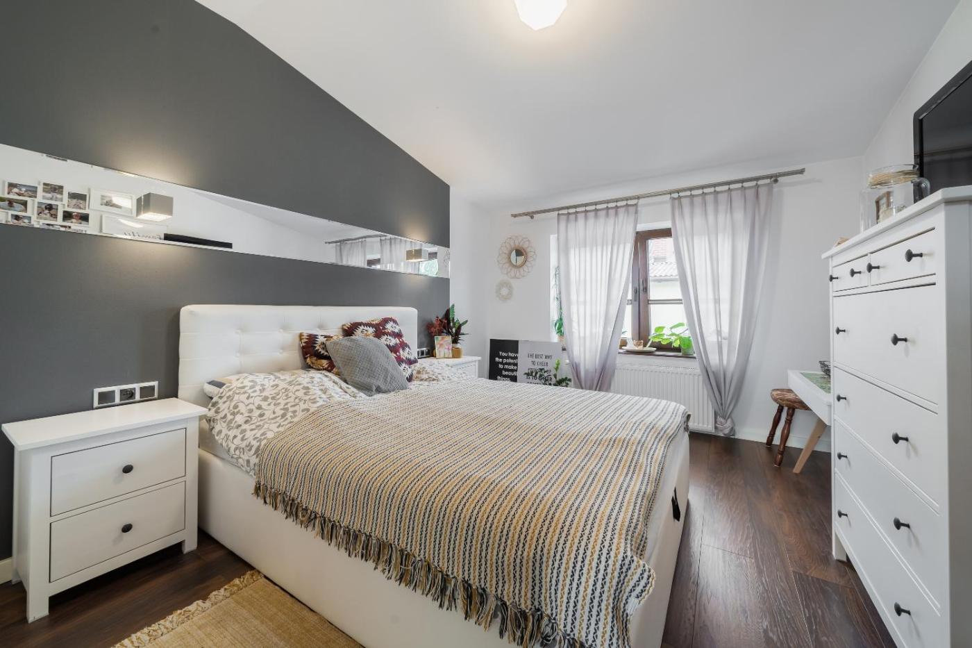 Dom z 2 sypialniami. Boasting a private entrance, this air-conditioned holiday home features a kitchen, 2 bedrooms and 1 bathroom with a walk-in shower and a bath. Guests will find a stovetop, a refrigerator, a dishwasher and kitchenware in the well-equipped kitchen. The holiday home also comes with a barbecue. Featuring a terrace with lake views, this holiday home also features a washing machine and a flat-screen TV with streaming services. The unit has 3 beds. Dom wakacyjny - 4 osobowy. Powierzchnia pokoju ok.: 90 mkw.